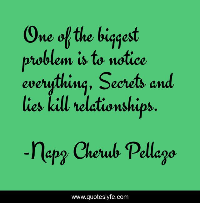 This page presents the quote "One of the biggest problem is to notice everything, Secrets and lies kill relationships.". Author of this quote is Napz Cherub Pellazo. This quote is about relationships, everything, secrets, lies, biggest-fear-of-mankind, kill,.
