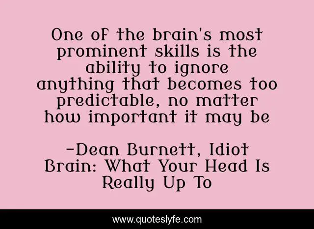 This page presents the quote "One of the brain's most prominent skills is the ability to ignore anything that becomes too predictable, no matter how important it may be". Author of this quote is Dean Burnett, Idiot Brain: What Your Head Is Really Up To. This quote is about brain, perception-of-reality, mind,.