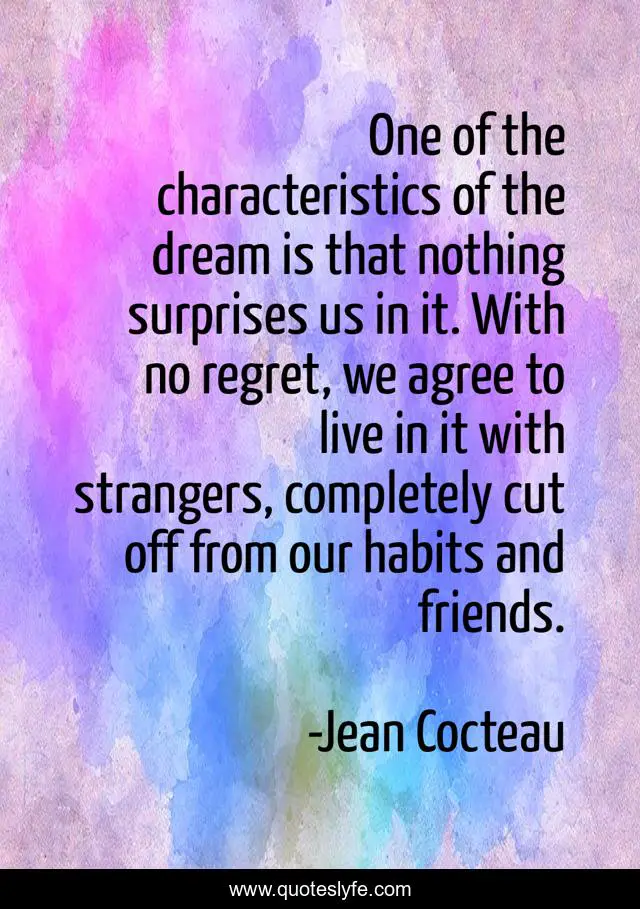 This page presents the quote "One of the characteristics of the dream is that nothing surprises us in it. With no regret, we agree to live in it with strangers, completely cut off from our habits and friends.". Author of this quote is Jean Cocteau. .