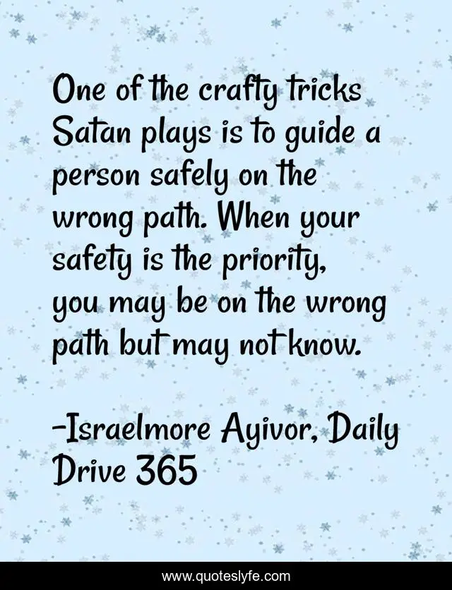 This page presents the quote "One of the crafty tricks Satan plays is to guide a person safely on the wrong path. When your safety is the priority, you may be on the wrong path but may not know.". Author of this quote is Israelmore Ayivor, Daily Drive 365. This quote is about direct, food-for-thought, devil, priority, safety, satan, israelmore-ayivor, direction, risk,.