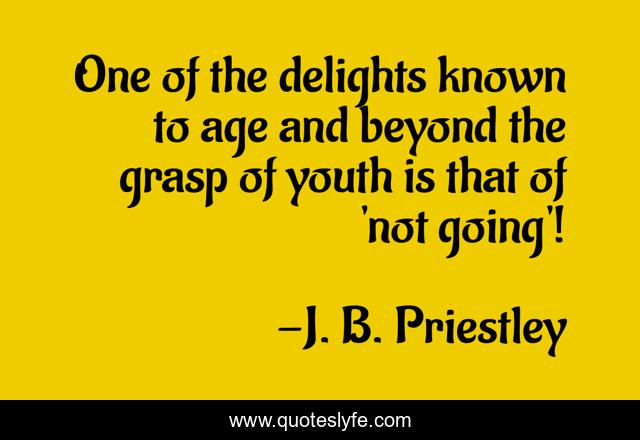 This page presents the quote "One of the delights known to age and beyond the grasp of youth is that of 'not going'!". Author of this quote is J. B. Priestley. This quote is about aging, age, old,.