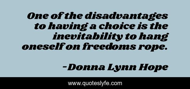 This page presents the quote "One of the disadvantages to having a choice is the inevitability to hang oneself on freedoms rope.". Author of this quote is Donna Lynn Hope. This quote is about freedom, responsibility, consequences, choice,.