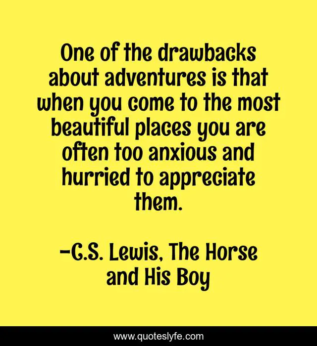 This page presents the quote "One of the drawbacks about adventures is that when you come to the most beautiful places you are often too anxious and hurried to appreciate them.". Author of this quote is C.S. Lewis, The Horse and His Boy. .