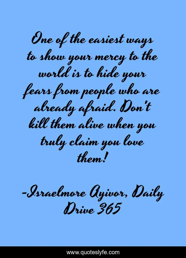 This page presents the quote "One of the easiest ways to show your mercy to the world is to hide your fears from people who are already afraid. Don't kill them alive when you truly claim you love them!". Author of this quote is Israelmore Ayivor, Daily Drive 365. This quote is about mercy, food-for-thought, afraid, hide, fright, people, fearful, frighten, kill-the-fears,.