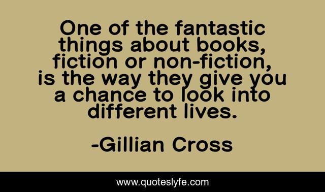 This page presents the quote "One of the fantastic things about books, fiction or non-fiction, is the way they give you a chance to look into different lives.". Author of this quote is Gillian Cross. This quote is about look, way,.