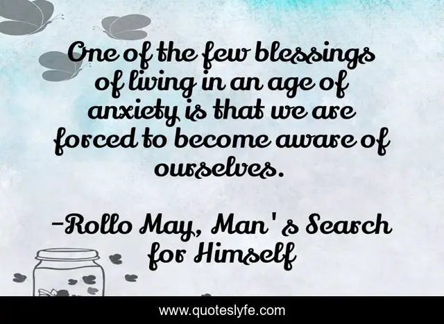 This page presents the quote "One of the few blessings of living in an age of anxiety is that we are forced to become aware of ourselves.". Author of this quote is Rollo May, Man's Search for Himself. This quote is about anxiety, self-awareness,.