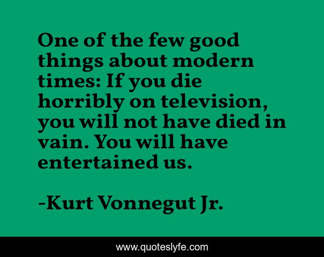 This page presents the quote "One of the few good things about modern times: If you die horribly on television, you will not have died in vain. You will have entertained us.". Author of this quote is Kurt Vonnegut Jr.. This quote is about activism, life, philosophical,.