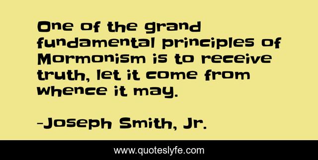 This page presents the quote "One of the grand fundamental principles of Mormonism is to receive truth, let it come from whence it may.". Author of this quote is Joseph Smith, Jr.. This quote is about may, principles, grand,.