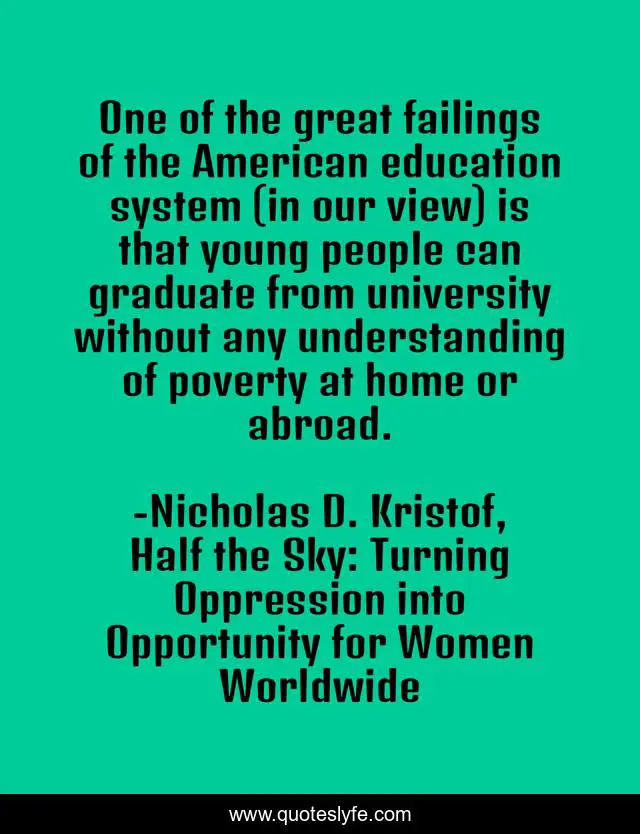 This page presents the quote "One of the great failings of the American education system (in our view) is that young people can graduate from university without any understanding of poverty at home or abroad.". Author of this quote is Nicholas D. Kristof, Half the Sky: Turning Oppression into Opportunity for Women Worldwide. This quote is about education, poverty, service,.