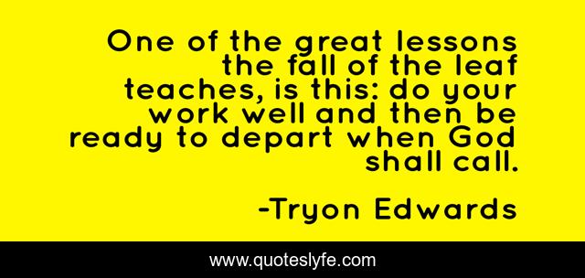 This page presents the quote "One of the great lessons the fall of the leaf teaches, is this: do your work well and then be ready to depart when God shall call.". Author of this quote is Tryon Edwards. This quote is about god, great, fall,.