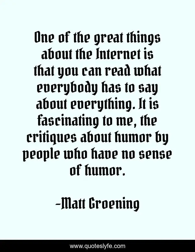 This page presents the quote "One of the great things about the Internet is that you can read what everybody has to say about everything. It is fascinating to me, the critiques about humor by people who have no sense of humor.". Author of this quote is Matt Groening. This quote is about me, great, internet,.