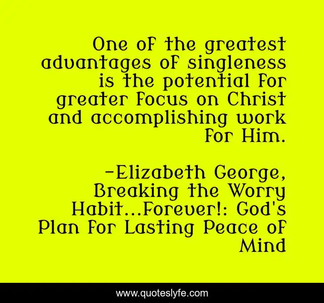 This page presents the quote "One of the greatest advantages of singleness is the potential for greater focus on Christ and accomplishing work for Him.". Author of this quote is Elizabeth George, Breaking the Worry Habit...Forever!: God's Plan for Lasting Peace of Mind. This quote is about life, love, advantage, singleness, god, work, young, calling, single,.