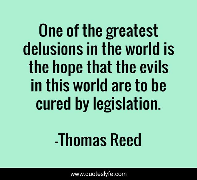This page presents the quote "One of the greatest delusions in the world is the hope that the evils in this world are to be cured by legislation.". Author of this quote is Thomas Reed. This quote is about world, cured, greatest,.