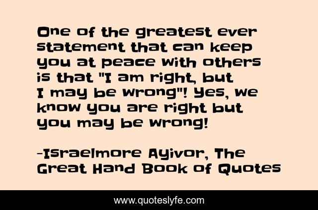 This page presents the quote "One of the greatest ever statement that can keep you at peace with others is that "I am right, but I may be wrong"! Yes, we know you are right but you may be wrong!". Author of this quote is Israelmore Ayivor, The Great Hand Book of Quotes. This quote is about right, i-am-right, at-peace, one, mistakes, apologize, be-humble, food-for-thought, peace,.