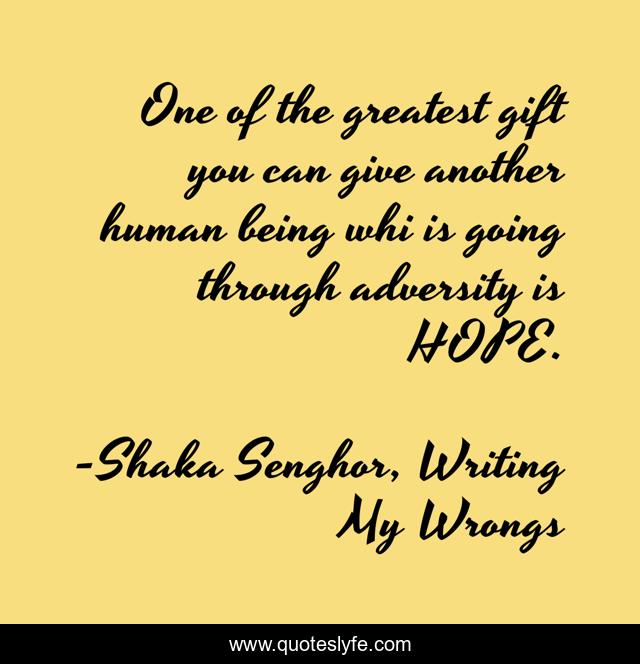This page presents the quote "One of the greatest gift you can give another human being whi is going through adversity is HOPE.". Author of this quote is Shaka Senghor, Writing My Wrongs. This quote is about hopelessness, okinyo, gift, writing-my-wrong, human-rights, human, hope, humanity-and-society, gifts,.