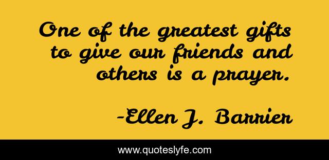 This page presents the quote "One of the greatest gifts to give our friends and others is a prayer.". Author of this quote is Ellen J. Barrier. This quote is about interceed, gift, god, quotes, meditate, prayer, meditation, friends, inspiration,.