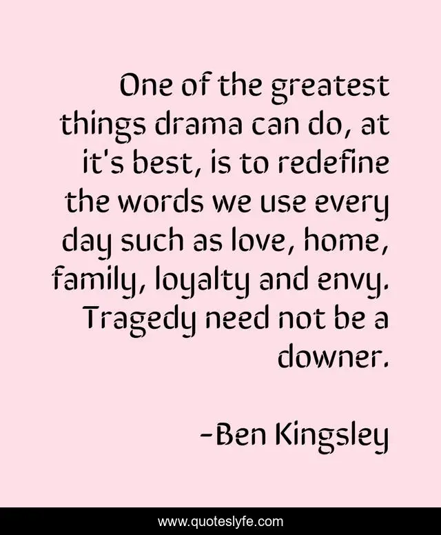 This page presents the quote "One of the greatest things drama can do, at it's best, is to redefine the words we use every day such as love, home, family, loyalty and envy. Tragedy need not be a downer.". Author of this quote is Ben Kingsley. This quote is about home, love, tragedy, affection,.