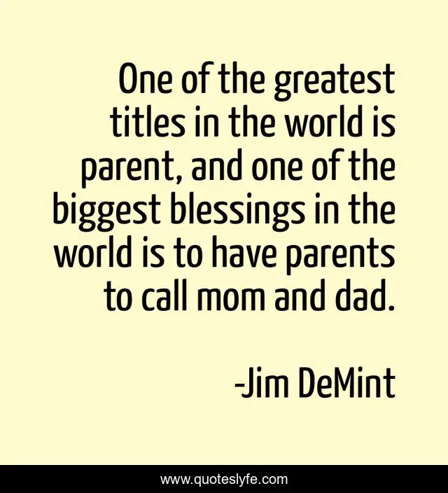 This page presents the quote "One of the greatest titles in the world is parent, and one of the biggest blessings in the world is to have parents to call mom and dad.". Author of this quote is Jim DeMint. This quote is about world, parents, mom,.