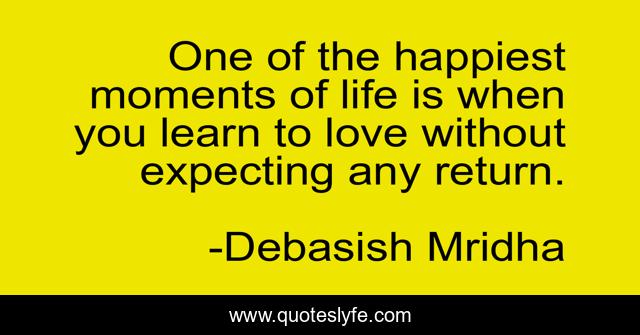 This page presents the quote "One of the happiest moments of life is when you learn to love without expecting any return.". Author of this quote is Debasish Mridha. This quote is about life, love, knowledge, inspirational, intelligence, philosophy, wisdom, quotes, affection,.