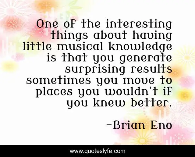 This page presents the quote "One of the interesting things about having little musical knowledge is that you generate surprising results sometimes you move to places you wouldn't if you knew better.". Author of this quote is Brian Eno. This quote is about better, interesting,.