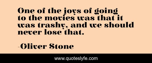 This page presents the quote "One of the joys of going to the movies was that it was trashy, and we should never lose that.". Author of this quote is Oliver Stone. This quote is about going, lose,.