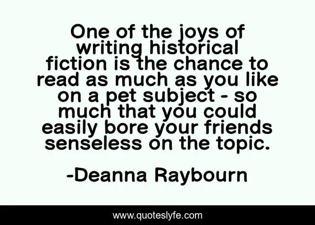 This page presents the quote "One of the joys of writing historical fiction is the chance to read as much as you like on a pet subject - so much that you could easily bore your friends senseless on the topic.". Author of this quote is Deanna Raybourn. This quote is about chance, friends, writing,.