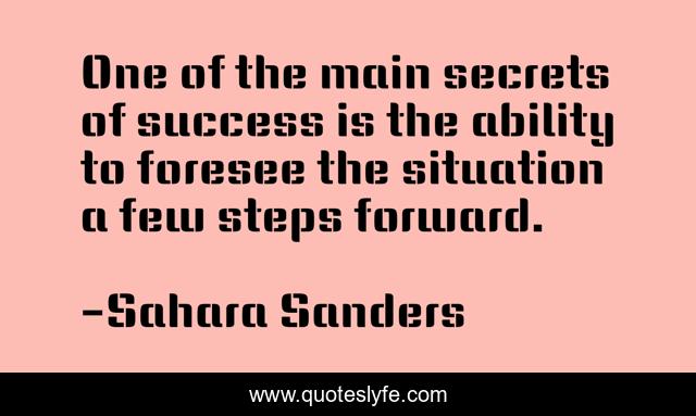 This page presents the quote "One of the main secrets of success is the ability to foresee the situation a few steps forward.". Author of this quote is Sahara Sanders. This quote is about success-in-real-life, success-strategies, successful-living, success, success-in-business,.