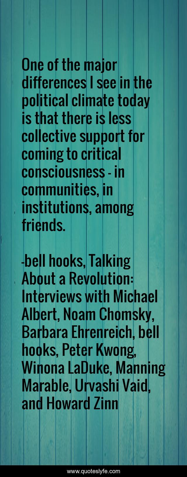This page presents the quote "One of the major differences I see in the political climate today is that there is less collective support for coming to critical consciousness – in communities, in institutions, among friends.". Author of this quote is bell hooks, Talking About a Revolution: Interviews with Michael Albert, Noam Chomsky, Barbara Ehrenreich, bell hooks, Peter Kwong, Winona LaDuke, Manning Marable, Urvashi Vaid, and Howard Zinn. This quote is about critical-thinking, consciousness,.