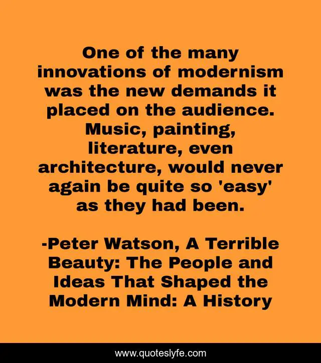 This page presents the quote "One of the many innovations of modernism was the new demands it placed on the audience. Music, painting, literature, even architecture, would never again be quite so 'easy' as they had been.". Author of this quote is Peter Watson, A Terrible Beauty: The People and Ideas That Shaped the Modern Mind: A History. This quote is about audience, innovation, modernism,.