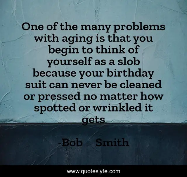 This page presents the quote "One of the many problems with aging is that you begin to think of yourself as a slob because your birthday suit can never be cleaned or pressed no matter how spotted or wrinkled it gets". Author of this quote is Bob Smith. This quote is about aging, birthday-suit, wrinkles,.