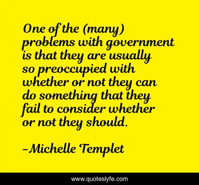 This page presents the quote "One of the (many) problems with government is that they are usually so preoccupied with whether or not they can do something that they fail to consider whether or not they should.". Author of this quote is Michelle Templet. This quote is about politics, philosophy, government,.