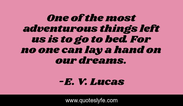 This page presents the quote "One of the most adventurous things left us is to go to bed. For no one can lay a hand on our dreams.". Author of this quote is E. V. Lucas. This quote is about adventurous, bed, hand,.