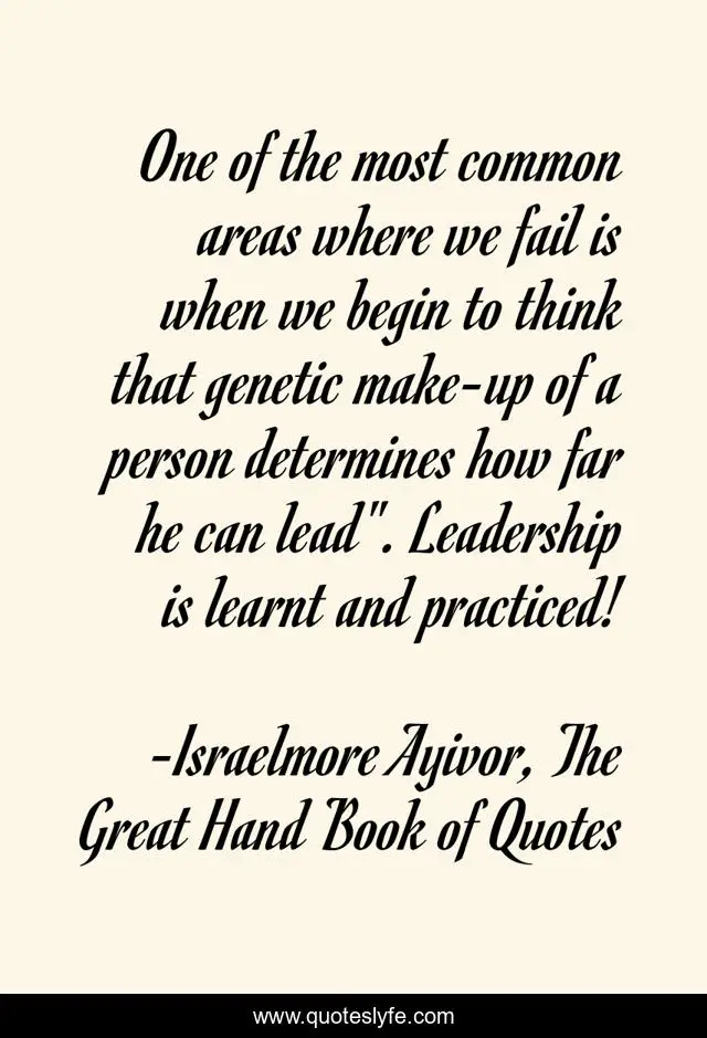 This page presents the quote "One of the most common areas where we fail is when we begin to think that genetic make-up of a person determines how far he can lead". Leadership is learnt and practiced!". Author of this quote is Israelmore Ayivor, The Great Hand Book of Quotes. This quote is about lead-people, begin, israelmor-ayivor, determines, inherted, lead, area, leadership, practice,.