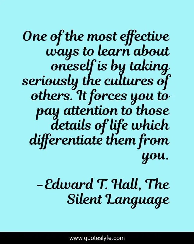 This page presents the quote "One of the most effective ways to learn about oneself is by taking seriously the cultures of others. It forces you to pay attention to those details of life which differentiate them from you.". Author of this quote is Edward T. Hall, The Silent Language. This quote is about culture, growth, deaf, silent,.