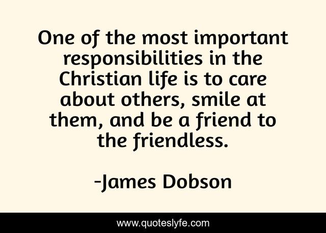 This page presents the quote "One of the most important responsibilities in the Christian life is to care about others, smile at them, and be a friend to the friendless.". Author of this quote is James Dobson. This quote is about life, christian, friend,.