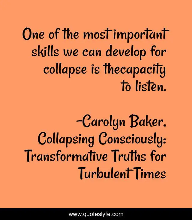 This page presents the quote "One of the most important skills we can develop for collapse is thecapacity to listen.". Author of this quote is Carolyn Baker, Collapsing Consciously: Transformative Truths for Turbulent Times. This quote is about activism, collapse, sacred,.