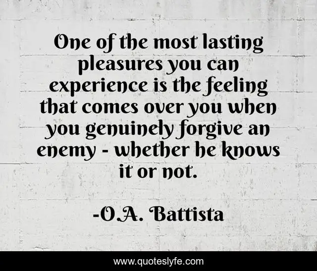 This page presents the quote "One of the most lasting pleasures you can experience is the feeling that comes over you when you genuinely forgive an enemy - whether he knows it or not.". Author of this quote is O.A. Battista. This quote is about enemy, forgiveness, forgive, quotes, quote, o-a-battista,.