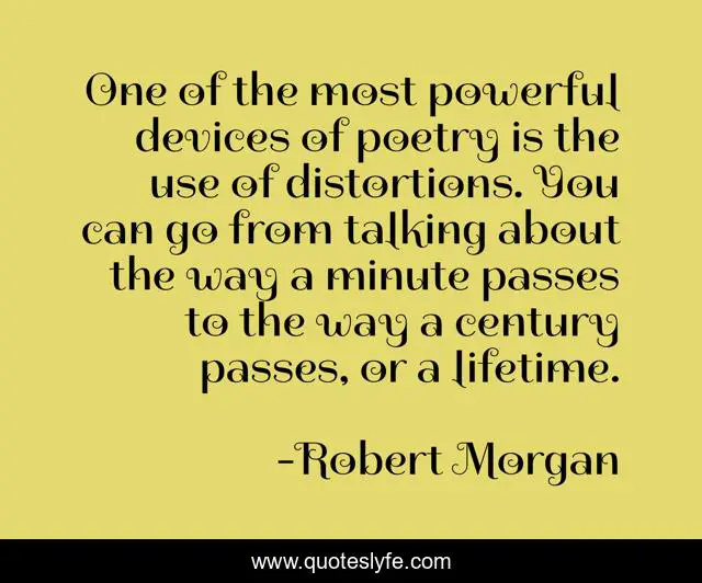 This page presents the quote "One of the most powerful devices of poetry is the use of distortions. You can go from talking about the way a minute passes to the way a century passes, or a lifetime.". Author of this quote is Robert Morgan. This quote is about powerful, way,.