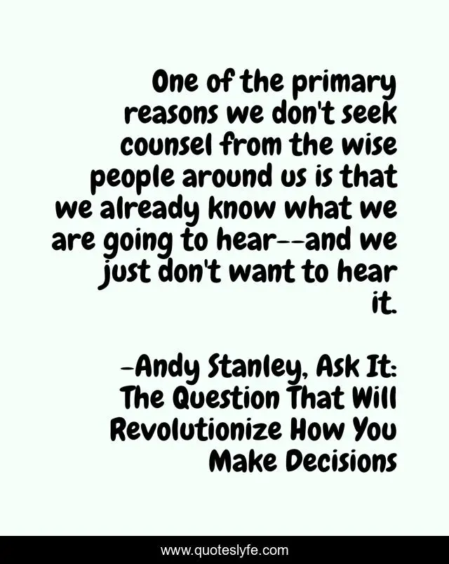 This page presents the quote "One of the primary reasons we don't seek counsel from the wise people around us is that we already know what we are going to hear--and we just don't want to hear it.". Author of this quote is Andy Stanley, Ask It: The Question That Will Revolutionize How You Make Decisions. This quote is about decision-making, morality, wisdom,.