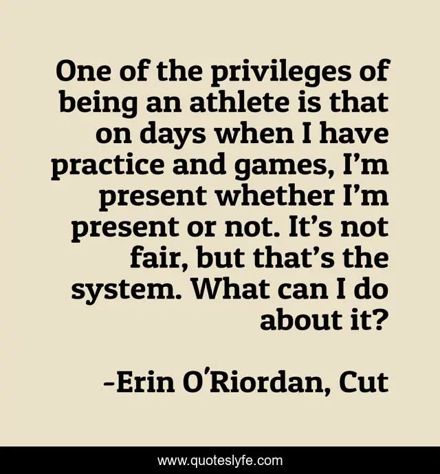 This page presents the quote "One of the privileges of being an athlete is that on days when I have practice and games, I’m present whether I’m present or not. It’s not fair, but that’s the system. What can I do about it?". Author of this quote is Erin O'Riordan, Cut. This quote is about privilege, unfairness, athletics, high-school, sports,.