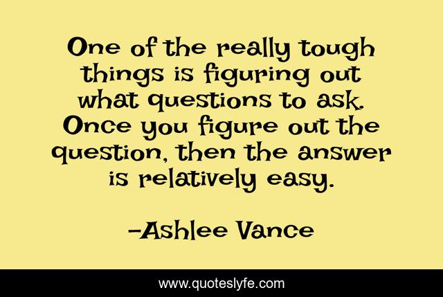 This page presents the quote "One of the really tough things is figuring out what questions to ask. Once you figure out the question, then the answer is relatively easy.". Author of this quote is Ashlee Vance. This quote is about tech, psychology, business, work-ethic,.