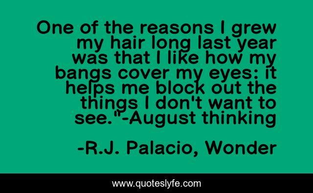 This page presents the quote "One of the reasons I grew my hair long last year was that I like how my bangs cover my eyes: it helps me block out the things I don't want to see."-August thinking". Author of this quote is R.J. Palacio, Wonder. This quote is about reasons, august, wonder,.