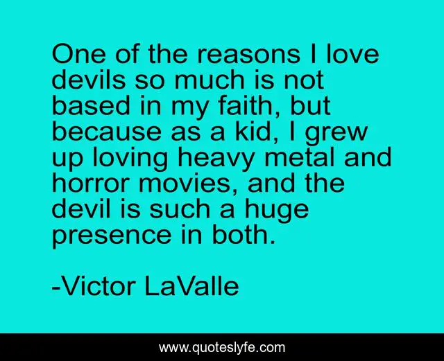 This page presents the quote "One of the reasons I love devils so much is not based in my faith, but because as a kid, I grew up loving heavy metal and horror movies, and the devil is such a huge presence in both.". Author of this quote is Victor LaValle. This quote is about faith, love, affection, loving,.