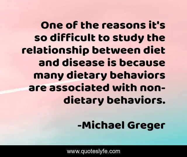 This page presents the quote "One of the reasons it's so difficult to study the relationship between diet and disease is because many dietary behaviors are associated with non-dietary behaviors.". Author of this quote is Michael Greger. This quote is about study, relationship,.
