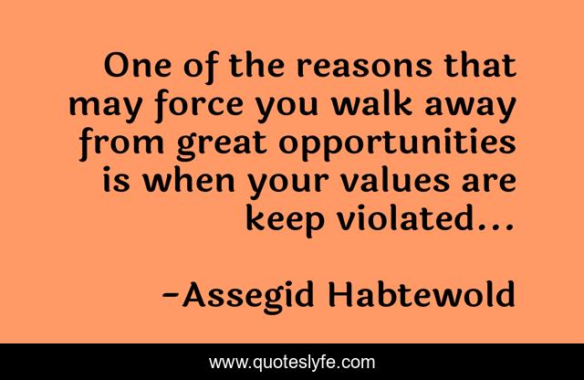 This page presents the quote "One of the reasons that may force you walk away from great opportunities is when your values are keep violated...". Author of this quote is Assegid Habtewold. This quote is about pro-leadership, violations, success-pathways, values, assegid-habtewold,.