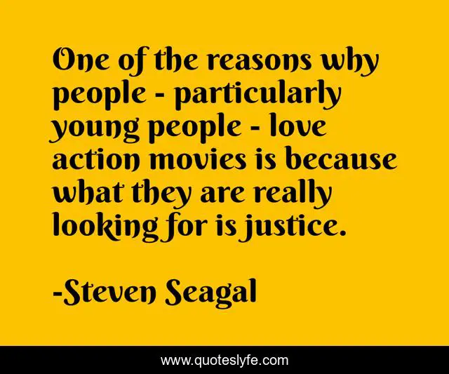This page presents the quote "One of the reasons why people - particularly young people - love action movies is because what they are really looking for is justice.". Author of this quote is Steven Seagal. This quote is about justice, action, love, affection,.