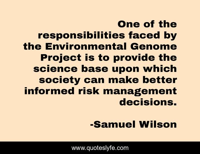 This page presents the quote "One of the responsibilities faced by the Environmental Genome Project is to provide the science base upon which society can make better informed risk management decisions.". Author of this quote is Samuel Wilson. This quote is about environmental, management,.