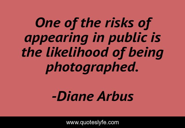 This page presents the quote "One of the risks of appearing in public is the likelihood of being photographed.". Author of this quote is Diane Arbus. .