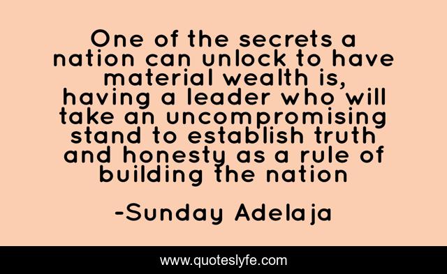 This page presents the quote "One of the secrets a nation can unlock to have material wealth is, having a leader who will take an uncompromising stand to establish truth and honesty as a rule of building the nation". Author of this quote is Sunday Adelaja. This quote is about building, uncompromising, honesty, material, nation, unlock, one-secrets, truth, establish,.