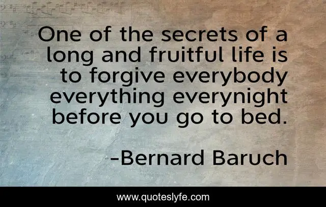This page presents the quote "One of the secrets of a long and fruitful life is to forgive everybody everything everynight before you go to bed.". Author of this quote is Bernard Baruch. This quote is about life, forgive, long,.